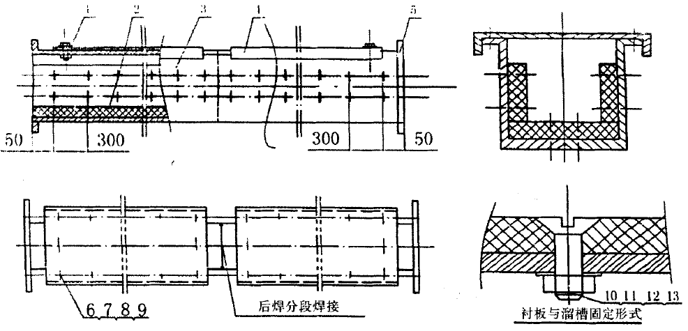 1-橡膠密封條(&=2rmn) 2-耐磨鋼板;3-溜槽;4-蓋板;5-端法蘭; 6-9_螺栓、螺母、密封圈10-13-沉頭螺釘、螺母、平墊、密封圈